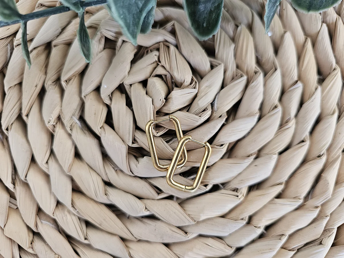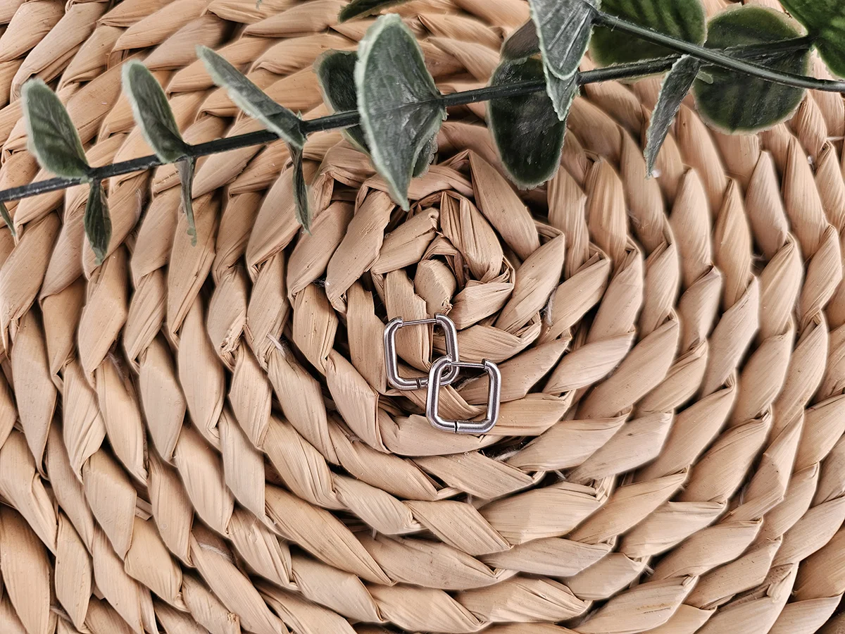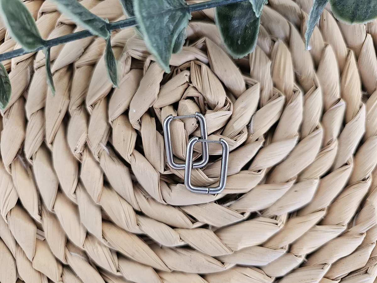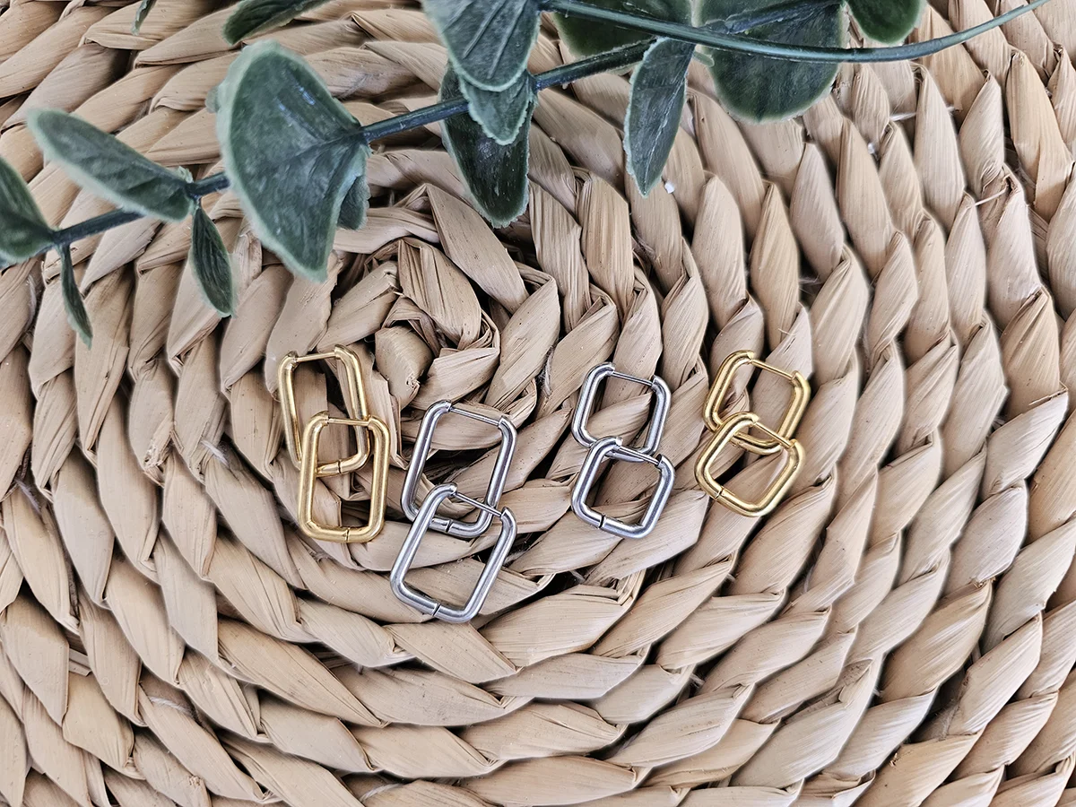 Aros rectangulares de acero inoxidable, ideales para combinar con charms, disponibles en dos tamaños diferentes. Este tipo de aros son perfectos para resaltar tus charms de manera elegante y duradera.