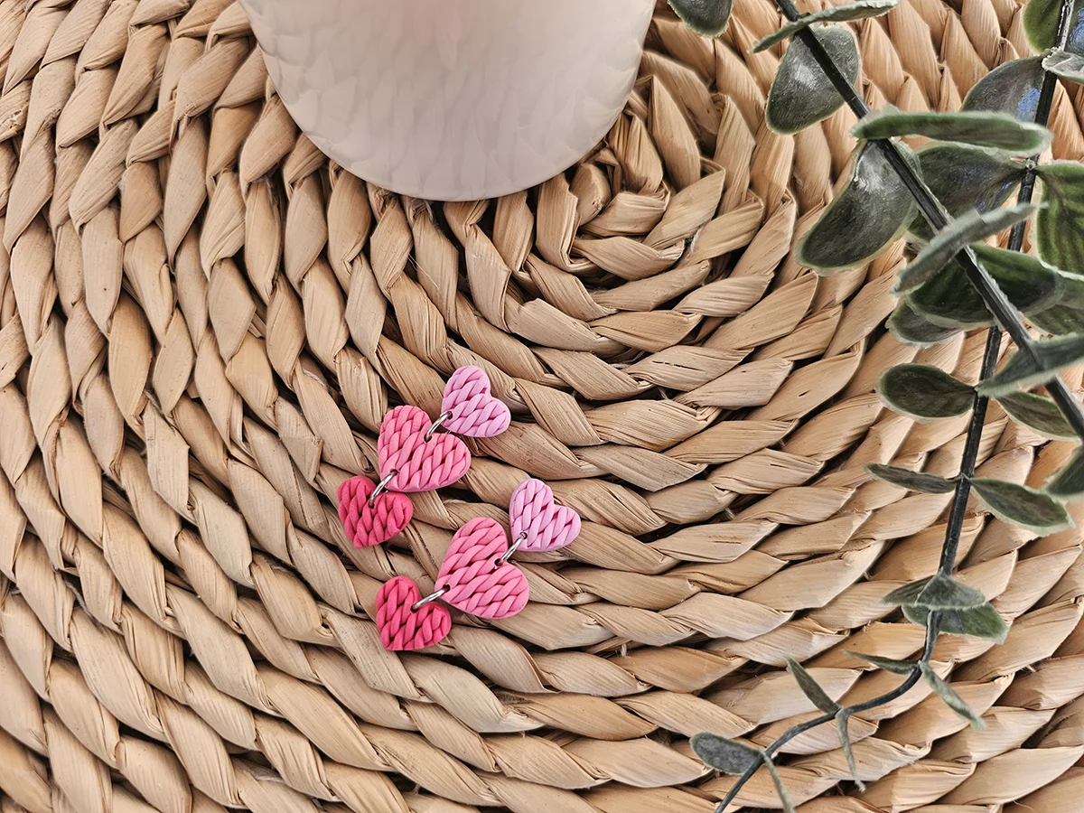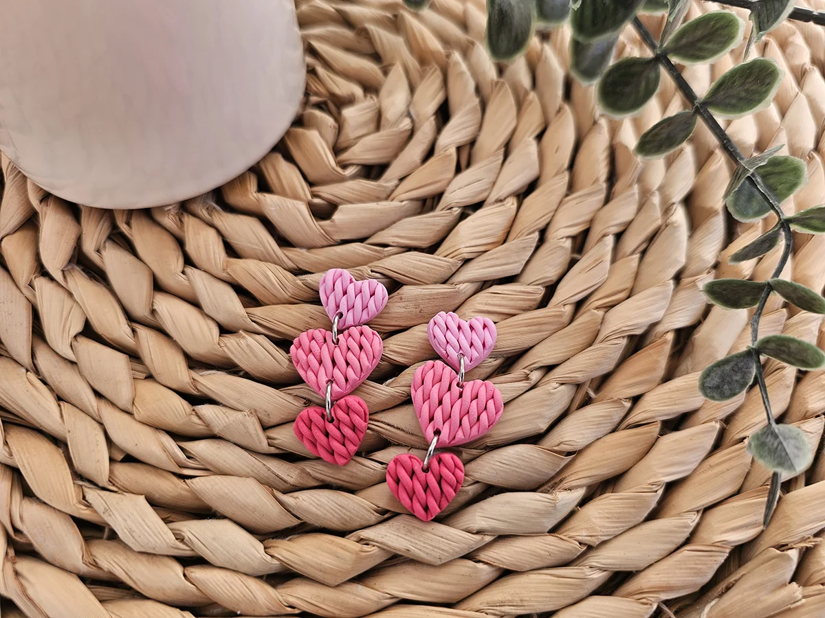 Los pendientes Carla de arcilla polimérica tienen la suavidad de los tonos de rosa evoca la delicadeza, mientras que el diseño tríptico agrega un toque moderno y chic.