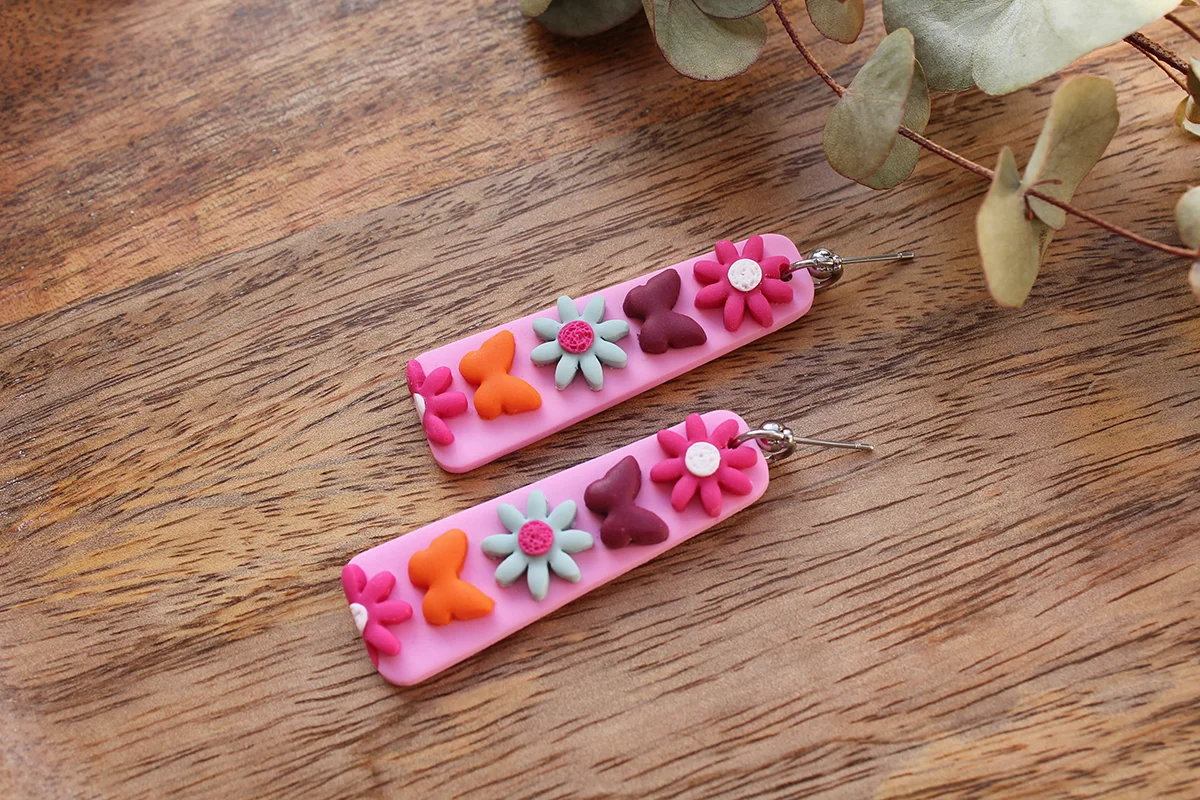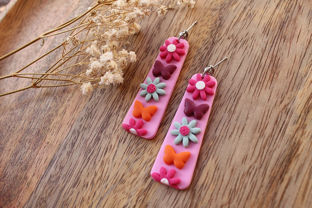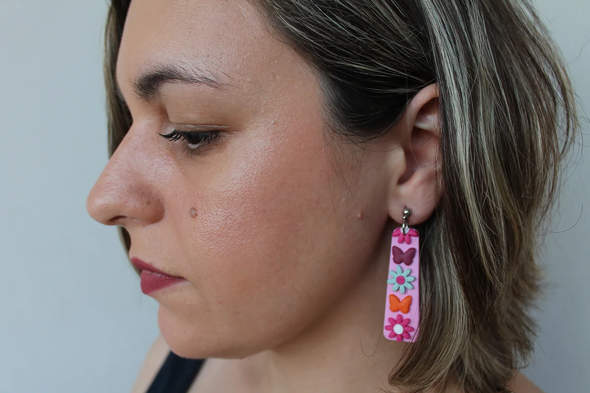 Estos encantadores pendientes alargados capturan la belleza y la delicadeza de la naturaleza en cada detalle. Presentan una serie de mariposas y flores estampadas en tonos vibrantes y diversos, creando un estallido de colores y alegría.