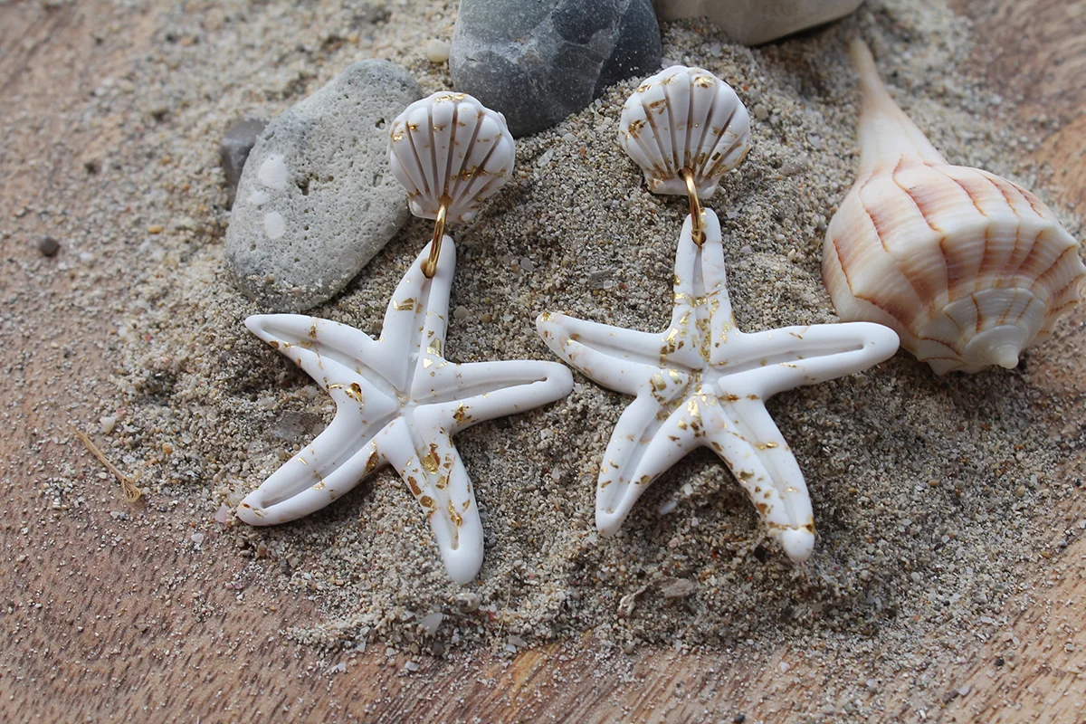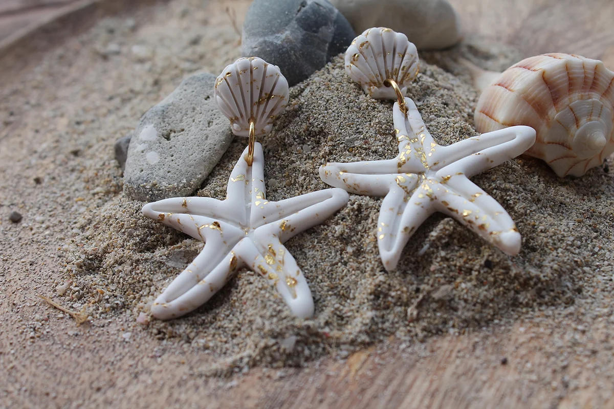 Estos exquisitos pendientes Moni capturan la elegancia y la magia del océano con su combinación única de una concha blanca con pan de oro y una estrella de mar más grande, también en blanco con pan de oro.